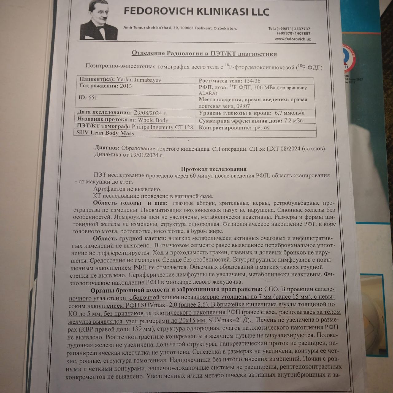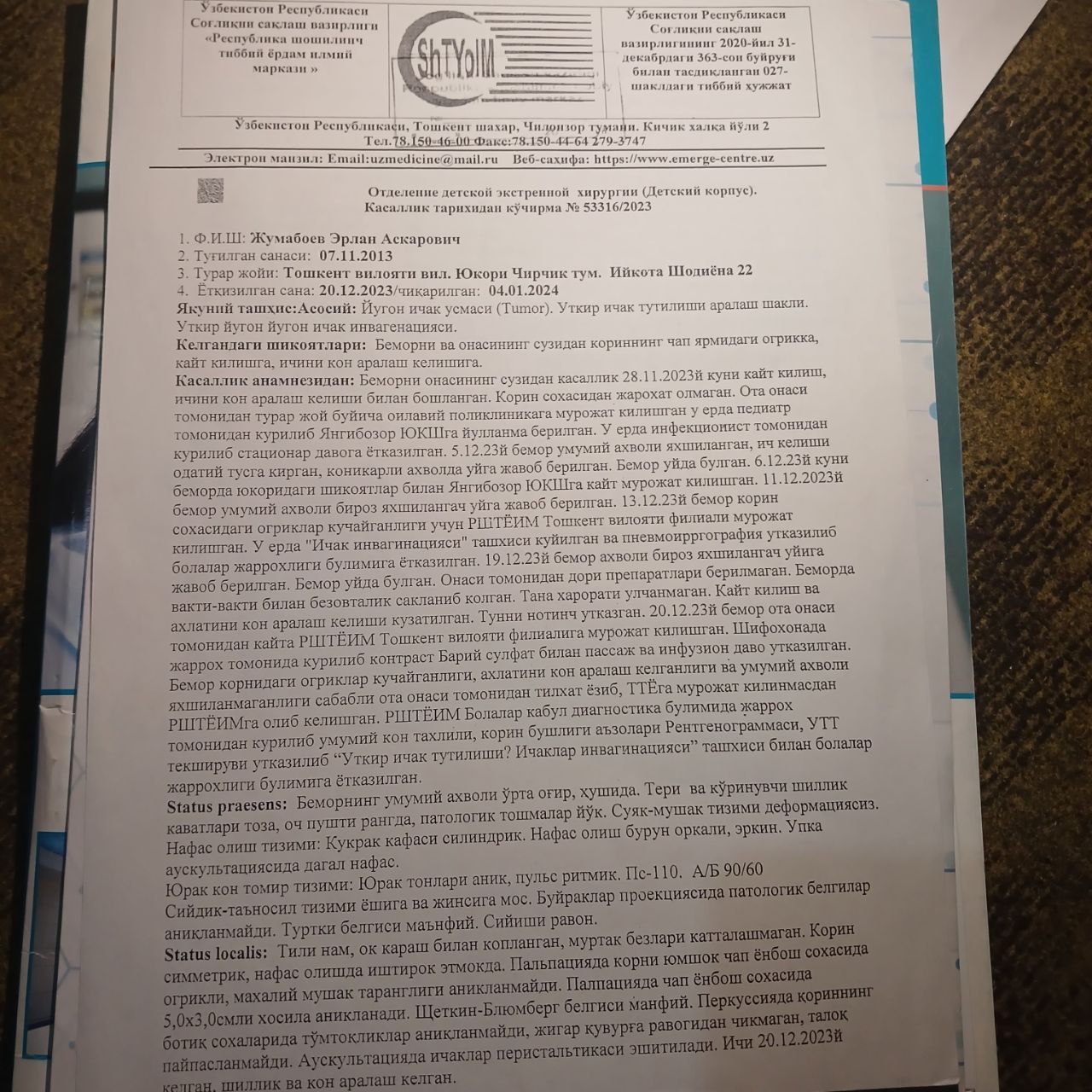 Men Arapbaeva Aydinay 1994-yilda Toshkent shahrining Bektemir tumanida tug'ilganman ๐ฉโ๐ฆ. Hozirda otam va onamni uyida 2 nafar farzandlarim bilan yashayman ๐ . Jumabayev Erlanjon 2013-yilda tug'ulgan ๐ถ. 2023-yil noyabr oyida bu og'ir kasallik boshlandi, hech nima yeyolmay qusishni boshladi ๐. Biz oshqazoni buzildi deb, Yuqori Chirchiqdagi shifohonaga olib bordik va 1 hafta davolandik harorati baland edi ๐ก๏ธ. Hammasi yaxshi bo'lgach, bir oydan so'ng Viloyat shifohonadiga 20-dekabr og'ir ahvolda 16-shifoxonaga olib bordik va 8 soat yo'gon ichakni operatsiya qildi ๐ฅ. Bir hafta Reanimatsiyada yotdi ๐. Tekshiruv natijalari Saraton Nixoshkin Lifoma 3-bosqich B hujayralik tashhisi qoyildi ๐. Respublika onko gemotologiyaga yotib Ximya terapiya boshladik 6-kurs oldik ๐. Doktor Komoliddin Ramzievich davoladi, Himya terapiyalarni juda qiyin o'tkardi ๐ข. Hamma mulojalarga pul tuladik barcha dori va himyalarini sotib oldik ๐. Yolg'iz ona bo'lganim uchun qo'limda etarli mablag' bo'lmagani uchun qarindosh va do'stlarimdan imkon qadar qarz oldik ๐ธ. Turar joyim yo'q ๐๏ธ. Hozirda Leykoz oq qon (qon raki) tashhisi qoyildi lekin davolashga etarli mablag'im yo'q ๐ญ. Doktorlar ilik quyish operatsiyasini qilishimizni aytishyapti ๐ฉบ. Hindistonga 45.000$ ga transplantatsiya qilishimiz kerak ๐ฎ๐ณ. Bolamni saqlab asrab qolishga yordam berishlarizni so'rayman iltimos ๐๐๐. Xalqim mensizlarga ishonaman โค๏ธ. Erlanjon o'g'lim ona men yashaymanmi, bu kasallik qachon tugaydi deb so'rayapti ๐ฌ. Sizlardan iltimos Erlanjon o'zini o'rtoqlari bilan birga o'qib, katta bo'lib o'z orzusiga yetishishiga va doktor bo'lishiga yordam beringlar ๐. Erlanjon o'g'limga duolaringiz va yordamingiz juda zarur ๐คฒ. Qo'llaringizdan kelgancha biz bilan birga Ollohim bergan dardni yengishiga yordam beringlar ๐ช. Sog'ayishiga yordam beringlar Iltimos ๐๏ธ.
